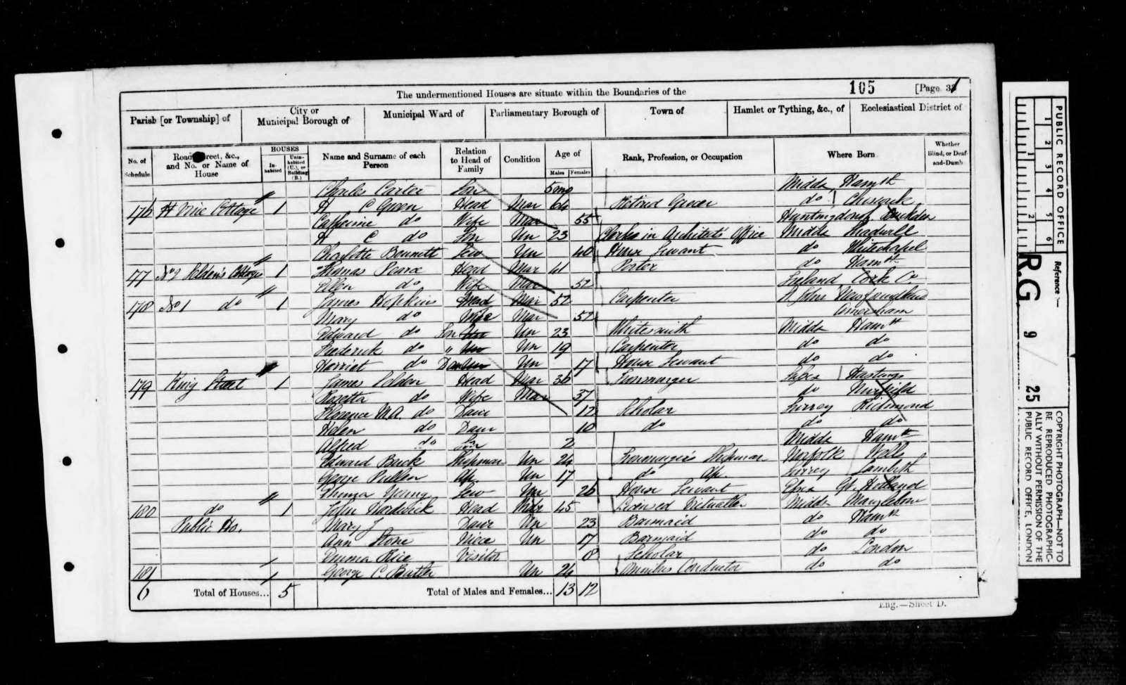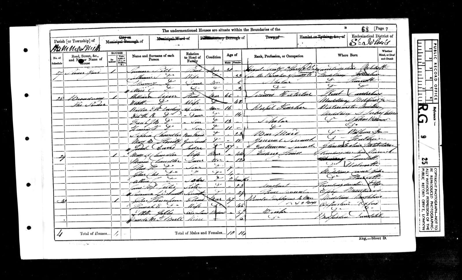 Source Combined Fields: <i>Census Returns of England and Wales, 1881</i>. Kew, Surrey, England: The National Archives of the UK (TNA): Public Record Office (PRO), 1881. <p>Images © Crown copyright. Images reproduced by courtesy of The National Archives, London, England.; <p>The National Archives give no warranty as to the accuracy, completeness or fitness for the purpose of the information provided.; <p>Images may be used only for purposes of research, private study or education. Applications for any other use should be made to <a href="http://www.nationalarchives.gov.uk/imagelibrary/" target="_blank">The National Archives Image Library</a>, Kew, Richmond, Surrey TW9 4DU, Tel: 020 8392 5225 Fax: 020 8392 5266.,