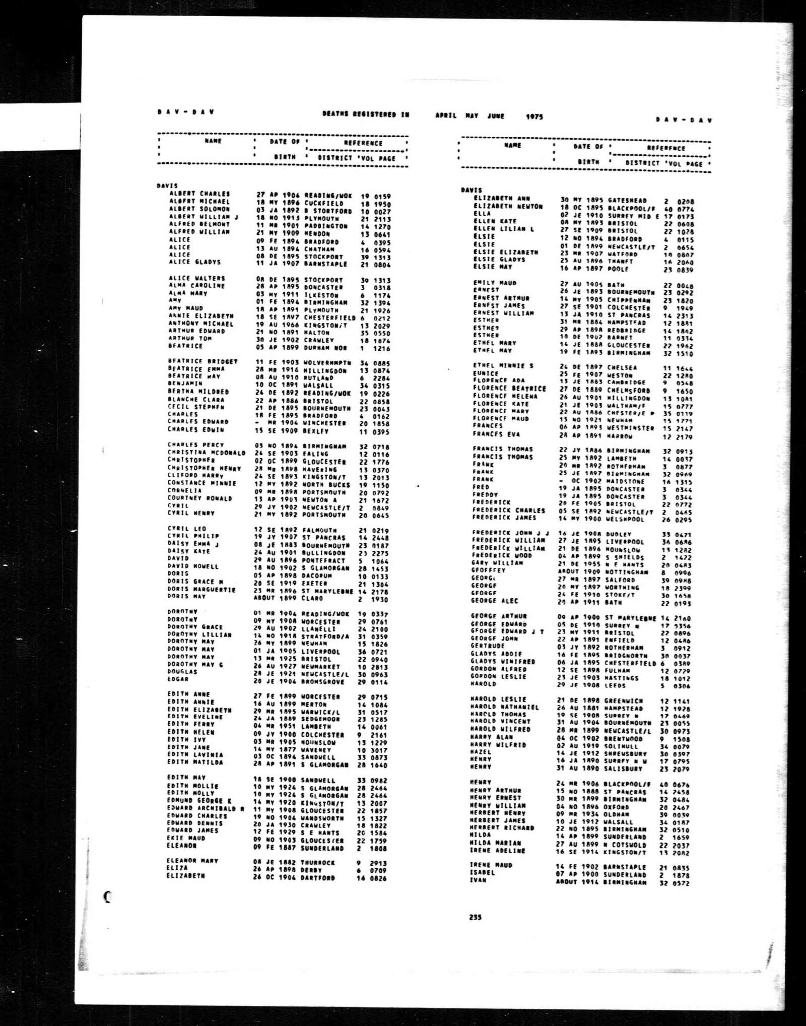 | Death | Thomas Joseph Davis died between July and September 1985, in Sandwell, Staffordshire, West Midlands, England. Note: Age: 61; Index: Volume 33 Page 1042 Registration 985.1 |