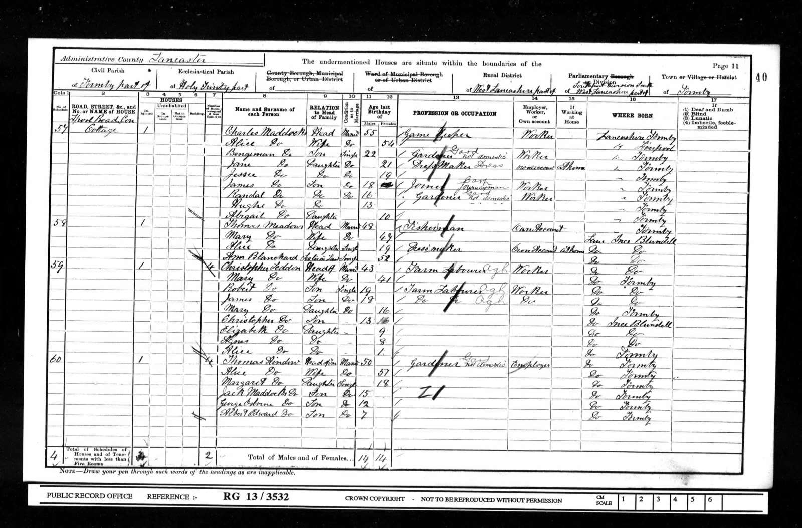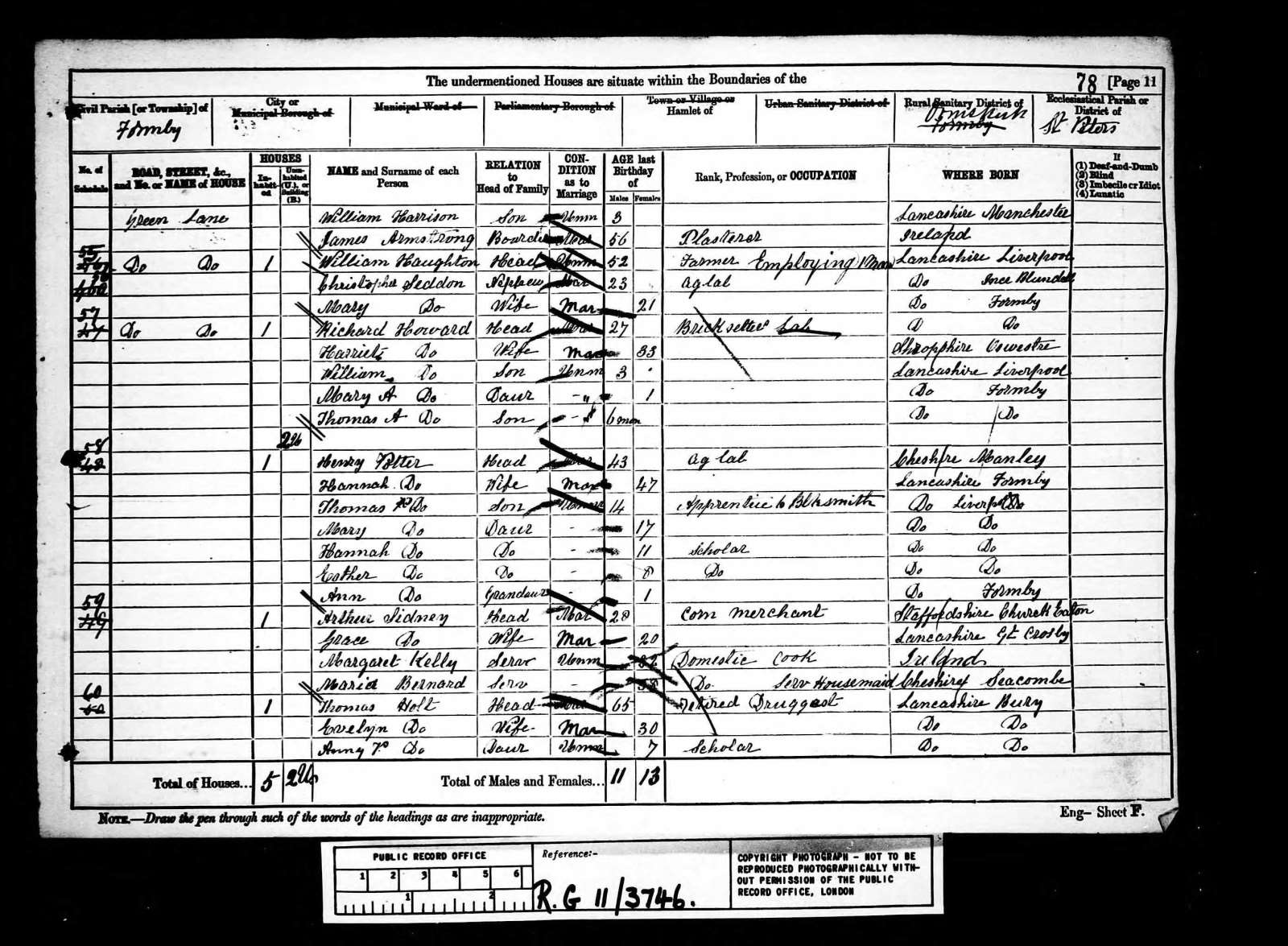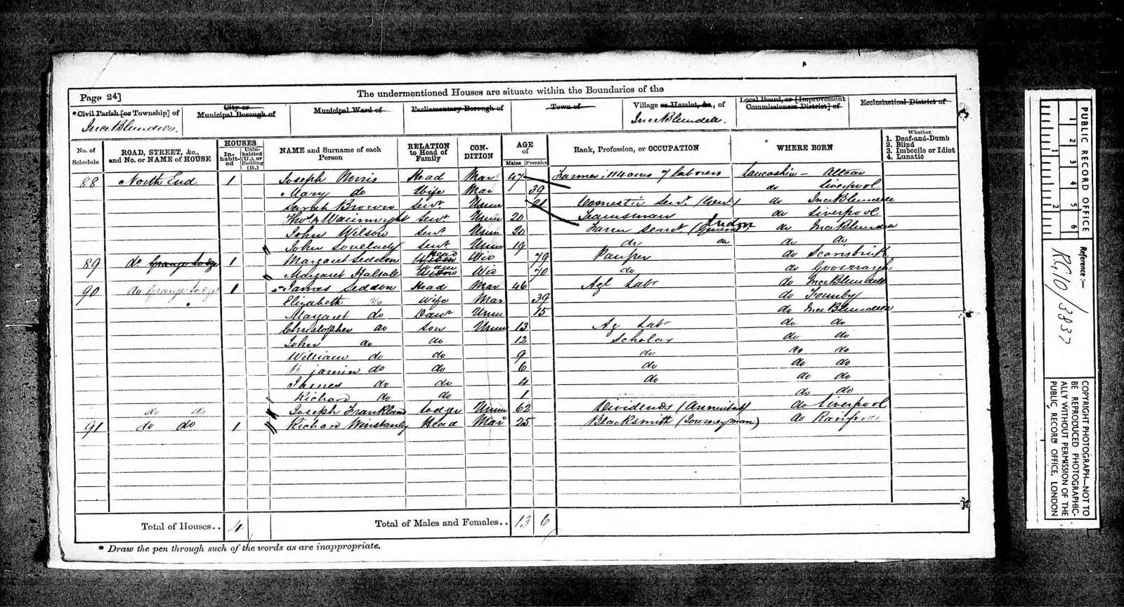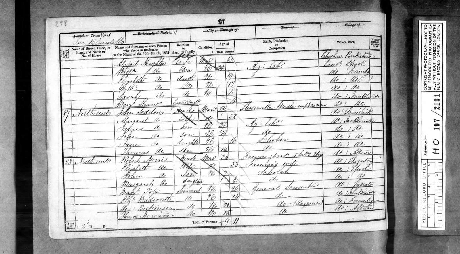 Citation Detail: Census for SEDDON, JOHN household of North End, Ince Blundell, Lancashire, England; Class: RG 9; Piece: 2725; Folio: 122; Page: 23; GSU roll: 543019,