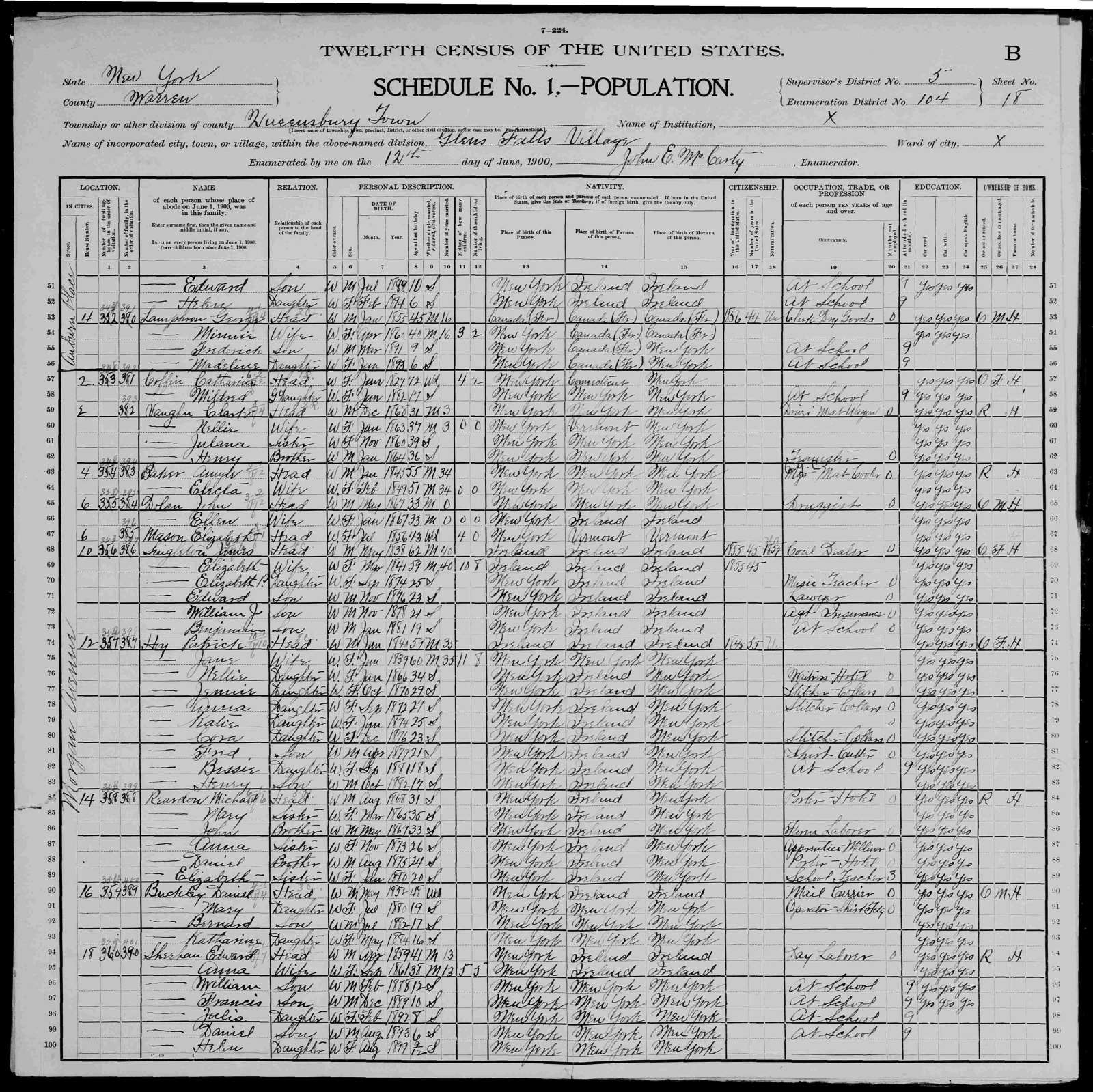 2 June 1900 | South Glens Falls, Saratoga, New York, USAG Enumerated on the census as Age: 28; Marital Status: Unmarried; Relation to Head: Son.