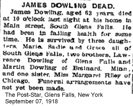 - [S1447] SOURCE (Short):, Title: "Memorials", Service: Find A Grave Inc., Lehi, Utah84043. USA, Find-A-Grave, Citation Detail: Grave for DOWLING, JAMES in Saint Marys Cemetery, South Glens Falls, Saratoga County, New York, USA; , Birth Date: 1851, Death Date: 1918 Find a Grave, database and images (www.findagrave.com/memorial/93146564/james-dowling: accessed 07 August 2021), memorial page for James Dowling (1851–1918), Find a Grave Memorial ID 93146564, citing Saint Marys Cemetery, South Glens Falls, Saratoga County, New York, USA; Maintained by RobMinteer57 (contributor 47389024).