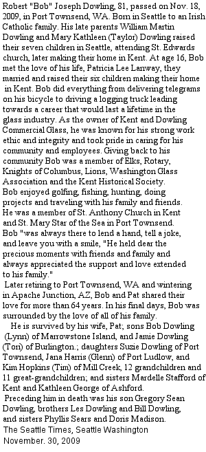 Find a Grave Obituary:- Son of William Martin Dowling and Mary Kathleen Taylor. Husband of Patricia Lee Lanway. Robert "Bob" Joseph DOWLING Robert Joseph Dowling, 81, passed on Nov. 18, 2009, in Port Townsend, WA. Born in Seattle to an Irish Catholic family. His late parents William Martin Dowling and Mary Kathleen (Taylor) Dowling raised their seven children in Seattle attending St. Edwards church, later making their home in Kent. At age 16, Bob met the love of his life, Patricia Lee Lanway, they married and raised their six children making their home in Kent. Bob did everything from delivering telegrams on his bicycle to driving a logging truck leading towards a career that would last a lifetime in the glass industry. As the owner of Kent and Dowling Commercial Glass, he was known for his strong work ethic and integrity and took pride in caring for his community and employees. Giving back to his community Bob was a member of Elks, Rotary, Knights of Columbus, Lions, Washington Glass Association and the Kent Historical Society. Bob enjoyed golfing, fishing, hunting, doing projects and traveling with his family and friends. He was a member of St. Anthony Church in Kent and St. Mary Star of the Sea in Port Townsend. Bob "was always there to lend a hand, tell a joke, and leave you with a smile, "He held dear the precious moments with friends and family and always appreciated the support and love extended to his family." Later retiring to Port Townsend, WA and wintering in Apache Junction, AZ, Bob and Pat shared their love for more than 64 years. In his final days, Bob was surrounded by the love of all of his family. He is survived by his wife, Pat; sons Bob Dowling (Lynn) of Marrowstone Island, and Jamie Dowling (Tori) of Burlington.; daughters Suzie Dowling of Port Townsend, Jana Harris (Glenn) of Port Ludlow, and Kim Hopkins (Tim) of Mill Creek, 12 grandchildren and 11 great-grandchildren; and sisters Mardelle Stafford of Kent and Kathleen George of Ashford. Preceding him in death was his son Gregory Sean Dowling, brothers Les Dowling and Bill Dowling, and sisters Phyllis Sears and Doris Madison. Funeral services take place at 10:00 a.m. on Thursday, Dec. 3 at St. Anthony's Chapel in Kent officiated by Father Vincent Pastro. Memorial to follow at the church hall. St. Anthony's is located 310 Third Ave S. Memorial contributions are suggested to the Alzheimer's Association , (alz.org) and Hospice.