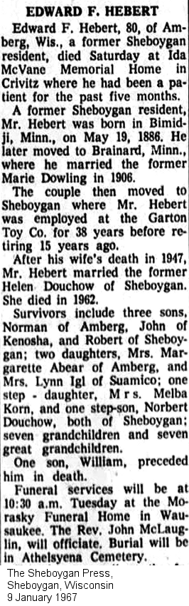 Citation Detail: Grave for HEBERT, EDWARD F. in Forest Home Cemetery, Athelstane, Marinette County, Wisconsin, USA; , Birth Date: 19 May 1886, Birth Place: Minnesota, USA, Death Date: 7 January 1967, Death Place: Crivitz, Marinette County, Wisconsin, USA; Find a Grave, database and images (www.findagrave.com/memorial/118903531/edward-f.-hebert: accessed 9 August 2021), memorial page for Edward F. Hebert (19 May 1886–7 Jan 1967), Find a Grave Memorial ID 118903531, citing Forest Home Cemetery, Athelstane, Marinette County, Wisconsin, USA; Maintained by RobtRogers (contributor 47376378).,
