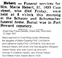 - [S1447] SOURCE (Short):, Title: "Memorials", Service: Find A Grave Inc., Lehi, Utah84043. USA, Find-A-Grave, Citation Detail: Grave for HEBERT, MARIE R. in Fort Howard Memorial Park, Green Bay, Brown County, Wisconsin, USA; , Birth Date: 1889, Birth Place: Crow Wing, Crow Wing County, Minnesota, USA, Death Date: 1947, Death Place: Green Bay, Brown County, Wisconsin, USA; Find a Grave, database and images (www.findagrave.com/memorial/84205564/marie-r.-hebert: accessed 9 August 2021), memorial page for Marie R. Dowling Hebert (1889–1947), Find a Grave Memorial ID 84205564, citing Fort Howard Memorial Park, Green Bay, Brown County, Wisconsin, USA; Maintained by Daniel Allen (contributor 47353628).;