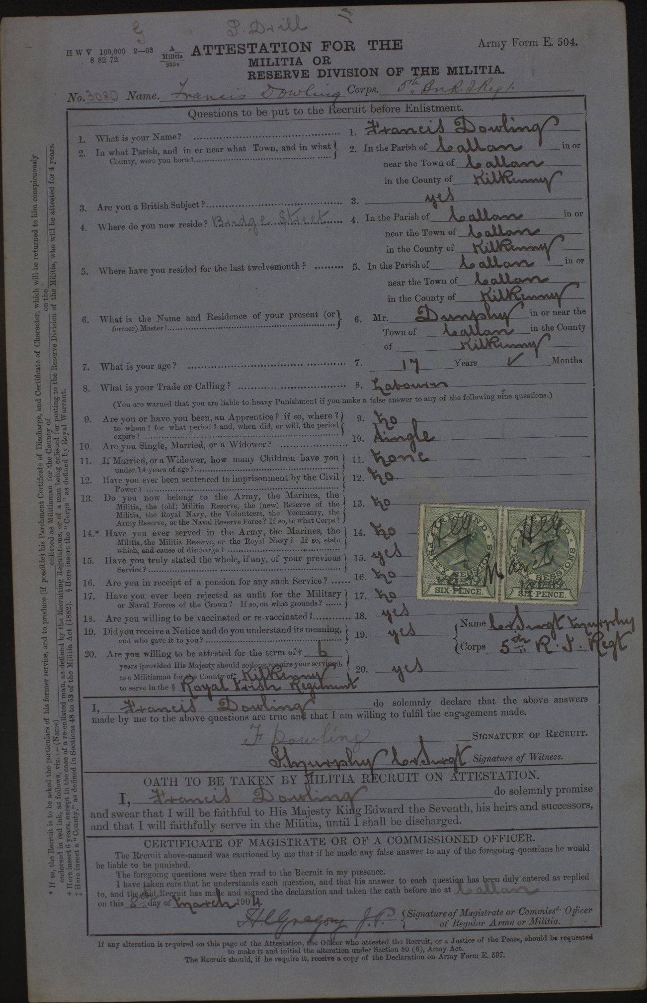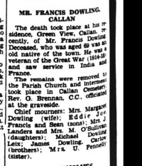 | Birth | He was born on 12 March 1885 in Callan, Callan, Kilkenny, Ireland. Note: Bridge Street, Barony: Callan; Poor Law Union: Callan; Province: Leinster: Informant: father Peter Dowling of Bridge Street Callan; Index: Callan - 1885.3 |
