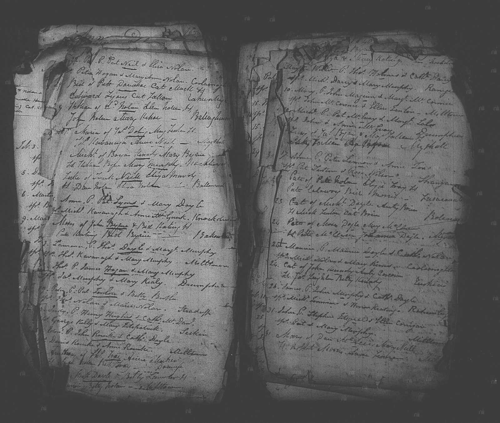 Citation Detail: Baptism of DOWLING, JOHN in Myshall parish, Carlow, Ireland on ? ? 1822; to Parents: Laughlin Dowlin & Margaret Dowlin; Sponsors: ? & Kinsella; Page notes: "Knockbrack",