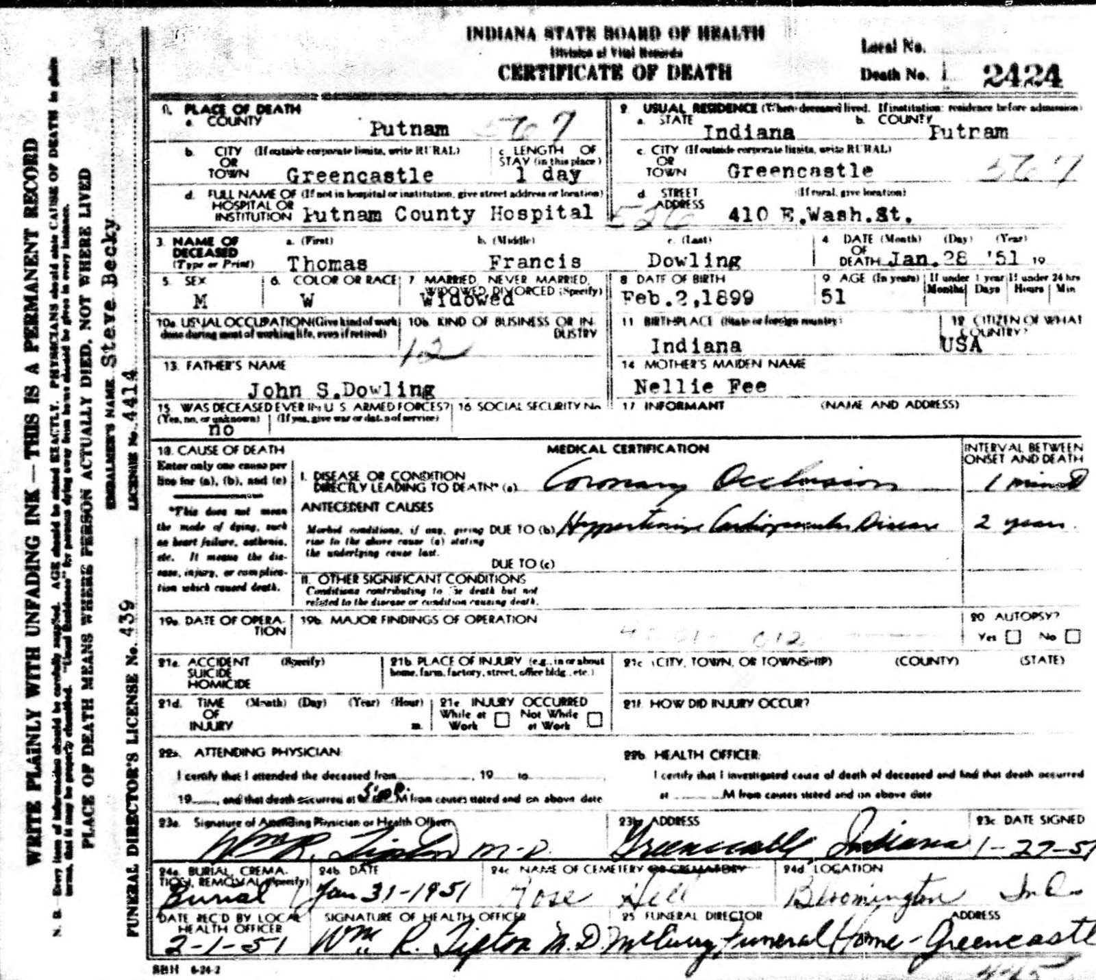 G. Note: Age: 76 years, 8 months, 21 days; Marital Status: Widowed; Putnam County Hospital; Informant: Thomas F Dowling of 410 E Wash St; Certificate 22647.