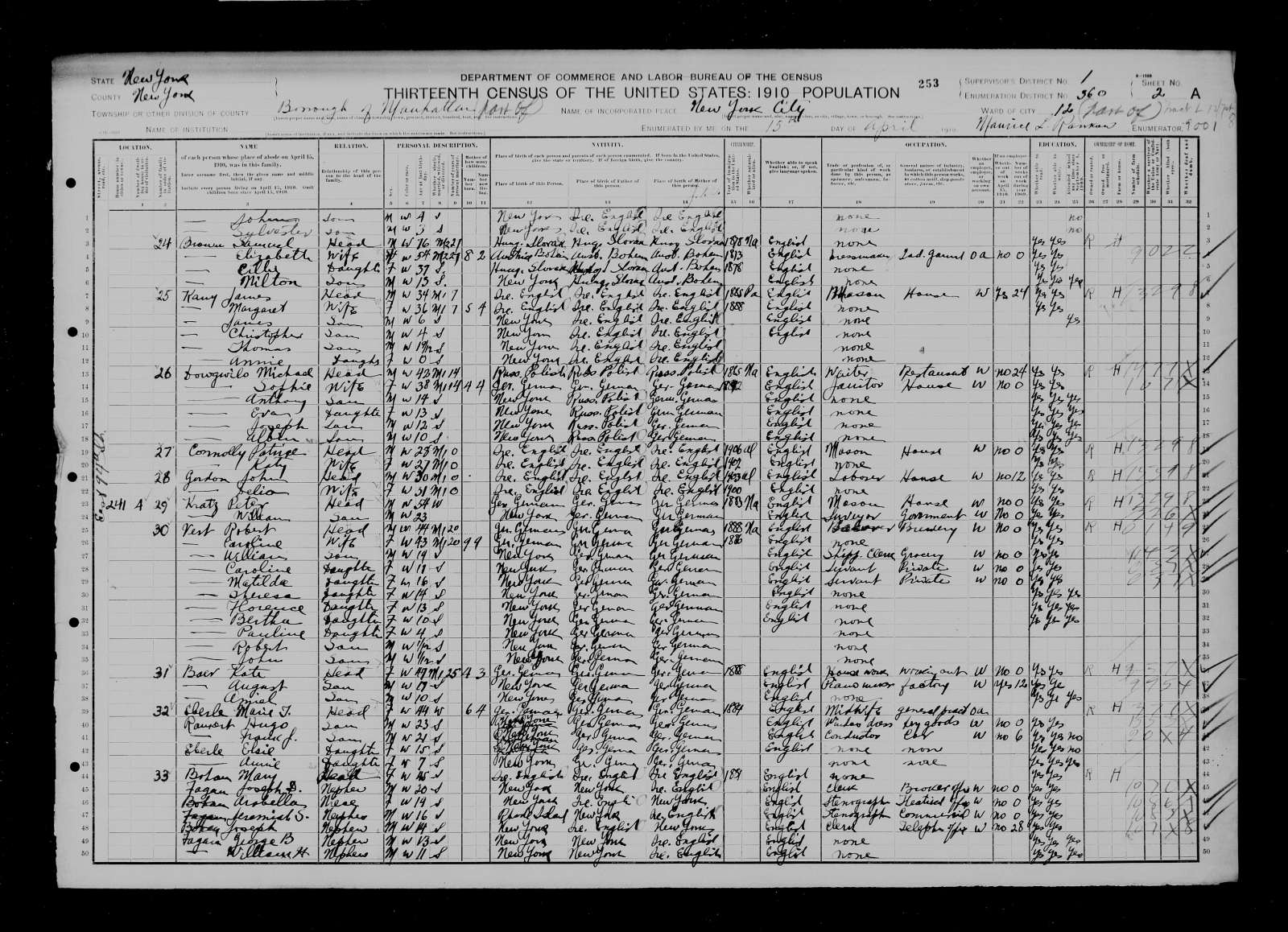 Citation Detail: Census for DOWLING, JAMES household of Manhattan Ward 12, New York, New York, United States of America. Record ID: USC/1910/004972995/00230/002; First name(s) Last name Relationship Marital status Gender Age Birth year James Dowling Self Married Male 32 1878 Margaret Dowling Wife Married Female 26 1884 Sylvester Dowling Son Single Male 9 1901 Annie Kerwin - Widowed Female 50 1860 Frank Maloney - Single Male 28 1882,