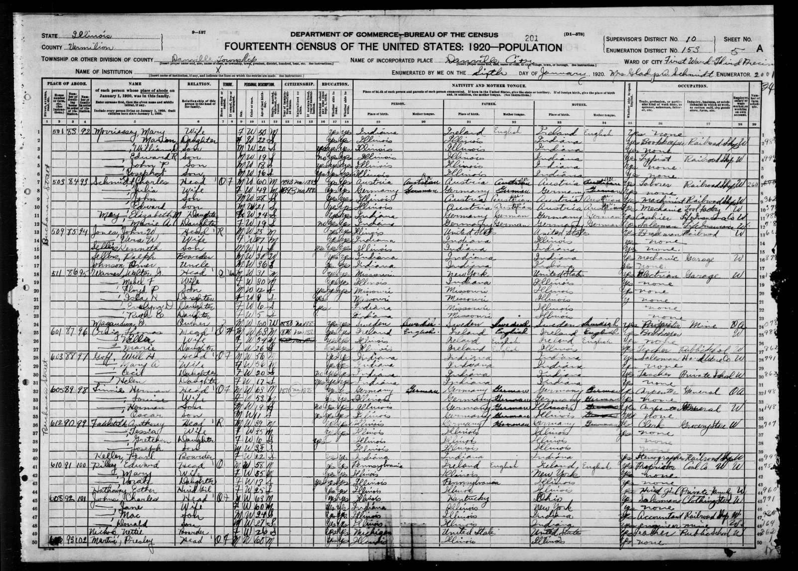 Citation Detail: Census for MORRISSEY, JOHN F household of , Vermilion, Illinois, United States of America. Nara Series: ; Record ID: USC/1920/004964836/00406/100; Acros two pages; First name(s) Last name Relationship Marital status Gender Age Birth year Birth place John F Morrissey Self Married Male 60 1860 Illinois Mary Morriessey Wife Married Female 50 1870 Indiana Marion Morriessey Daughter Single Female 22 1898 Illinois William D Morriessey Son Single Male 20 1900 Illinois Edward R Morriessey Son Single Male 19 1901 Illinois John P Morriessey Son Single Male 18 1902 Illinois Joseph S Morriessey Son Single Male 16 1904 Illinois,